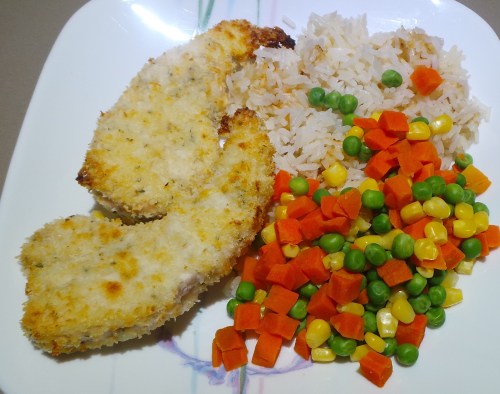 So, after it’s been cut to shape, the chicken is then seasoned with salt and pepper and put through an assembly line coating process. You’ll need three plates: one with plain flour, one with beaten egg whites and one with a mix of breadcrumbs and shredded or desiccated coconut. You can also get older children involved in this part, thereby cutting the labour for you!