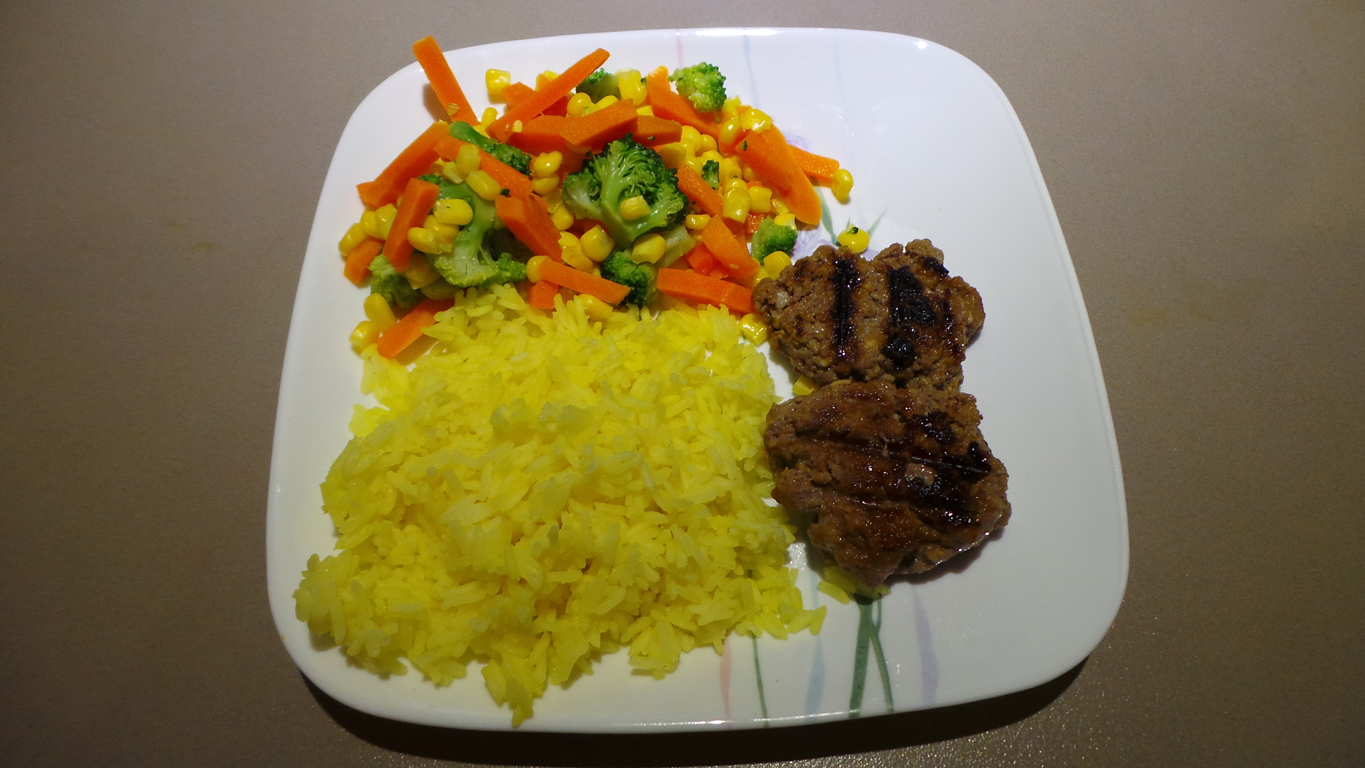 Dinner: Asian flavoured meatballs, with mixed vegetables and turmeric rice