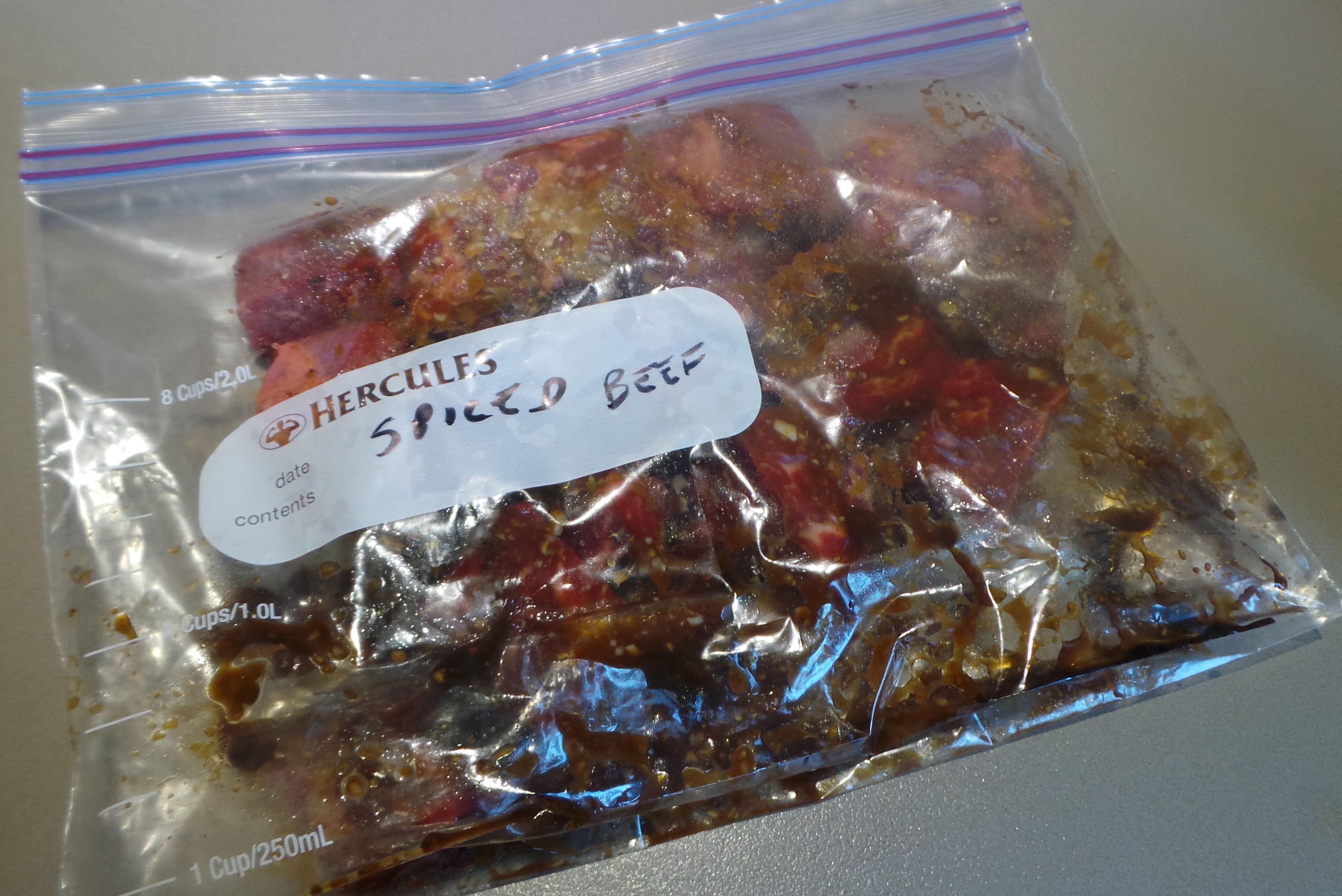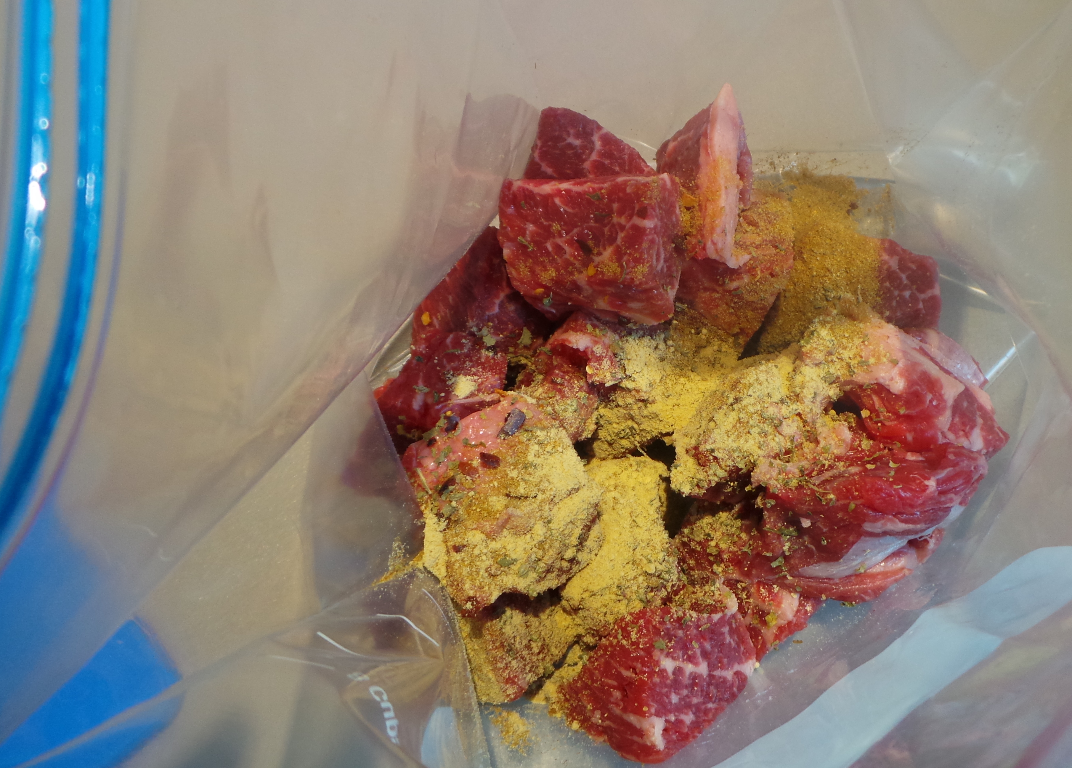 Seal up the bag and massage the spices through. It’s better to do it this way than to use an implement in the bag as you may pierce it and accidentally lay a path for freezer burn. That would be bad.