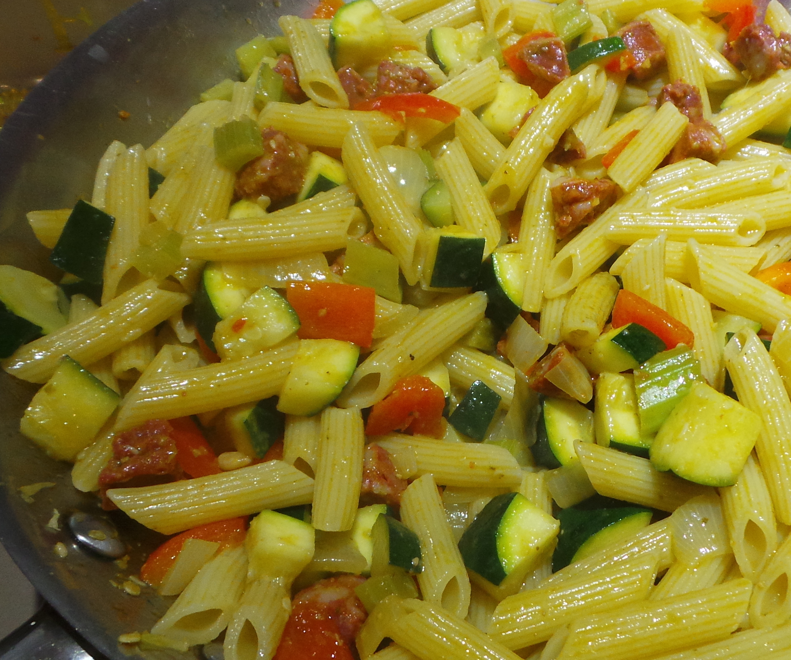Dinner tonight was going to be risotto, but I didn’t have enough Arborio rice. So I did a pasta dish instead, mixing up the rest of the fresh vegies in the fridge with some chorizo, penne and pesto. It was yummy, if I do say so myself.