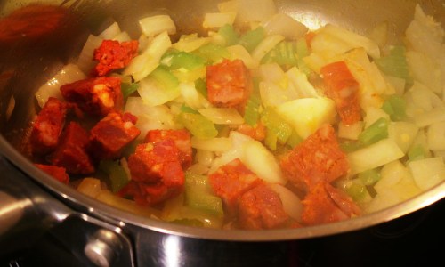 A splash of olive oil went into the pot and the onion was added and cooked until translucent, accompanied by a spoonful of garlic from a jar. Then I added the celery and, when that was soft, I added the diced sausage.
