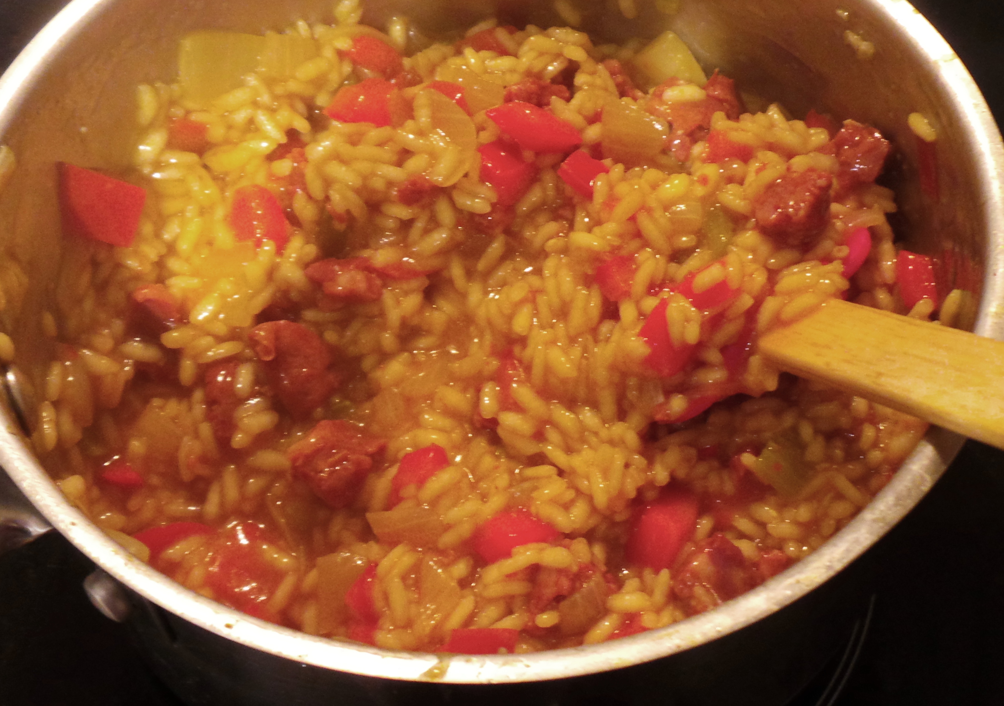 I had a few bits and pieces I wanted to use up, so that’s what’s gone into this meal. An onion, a stick of celery, half a large red pepper and a chorizo were all pressed into service. I started by chopping them up as finely as my motor skills would allow – which wasn’t very.