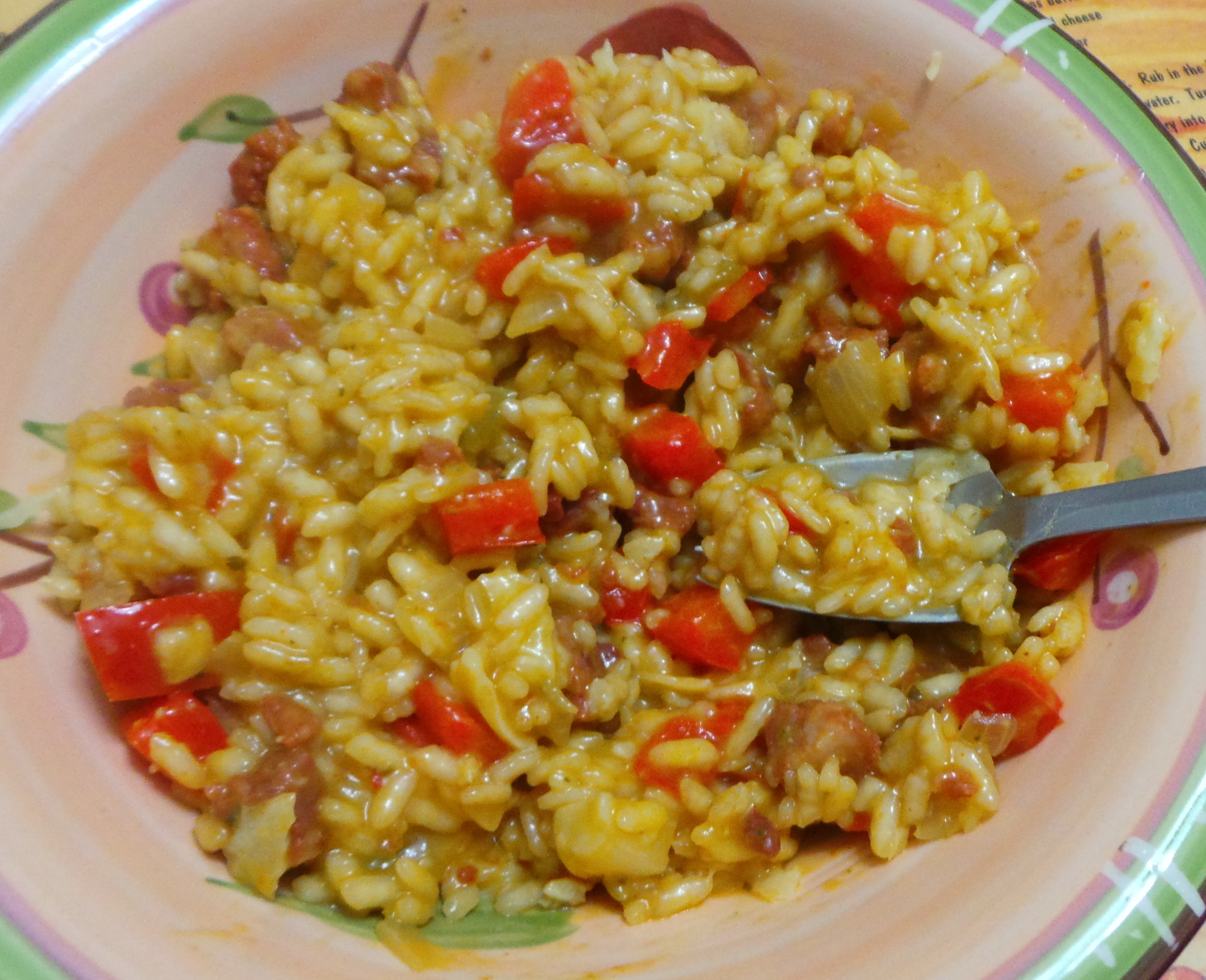 In my kitchen, risotto is a way to mix quite a few different vegetables (or bits of vegetables) and a little meat into a warm, creamy, comforting bowl of hot, moist rice.