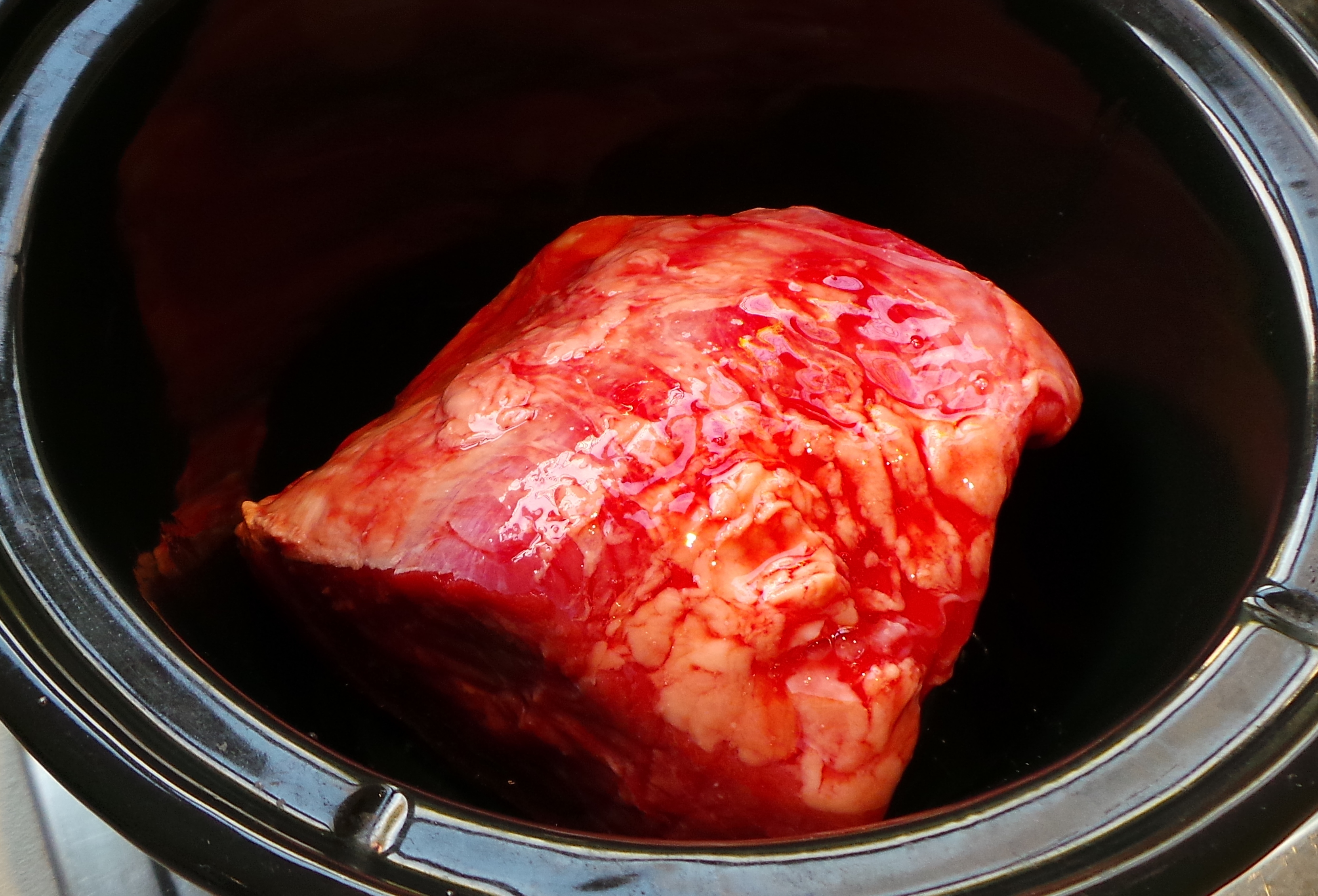 So, to cook a piece of corned beef, you first need to find a pot big enough to put it in. Make sure it’s one that will take the beef, any flavourings you may use and enough water to cover the lot of it. In the photograph, I’m using a 3 litre slow cooker that has a tall, narrow crock.