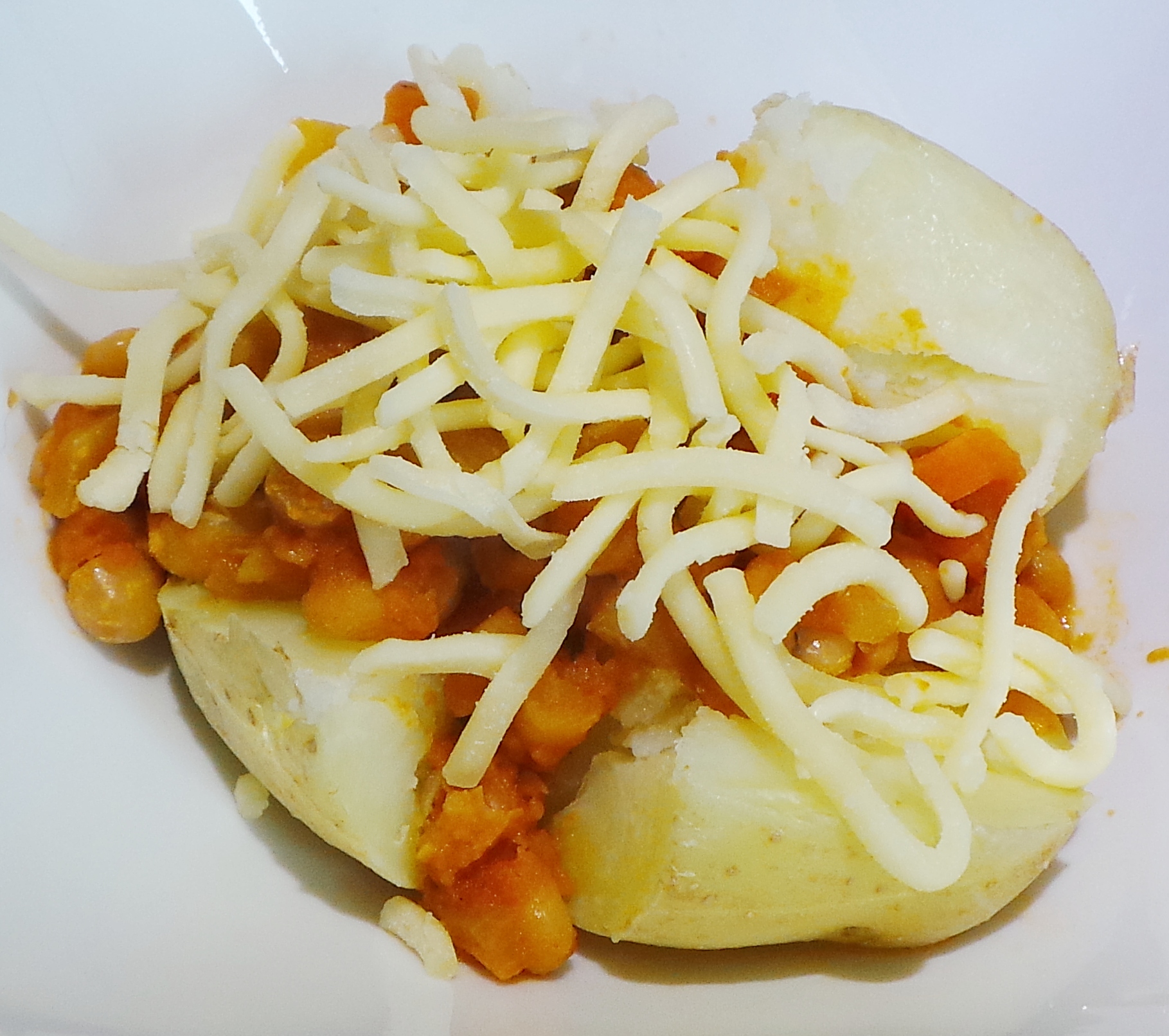 While it heats, get some grated cheese out of the fridge (or grate some). Top your potato and beans.