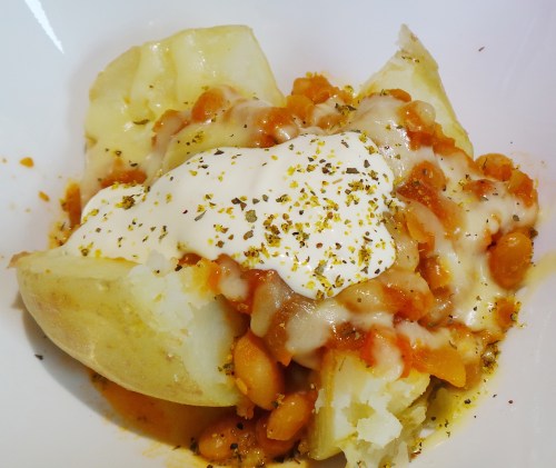 Top your potato with the beans, cover and put it back into the microwave for a further minute at 100% power.