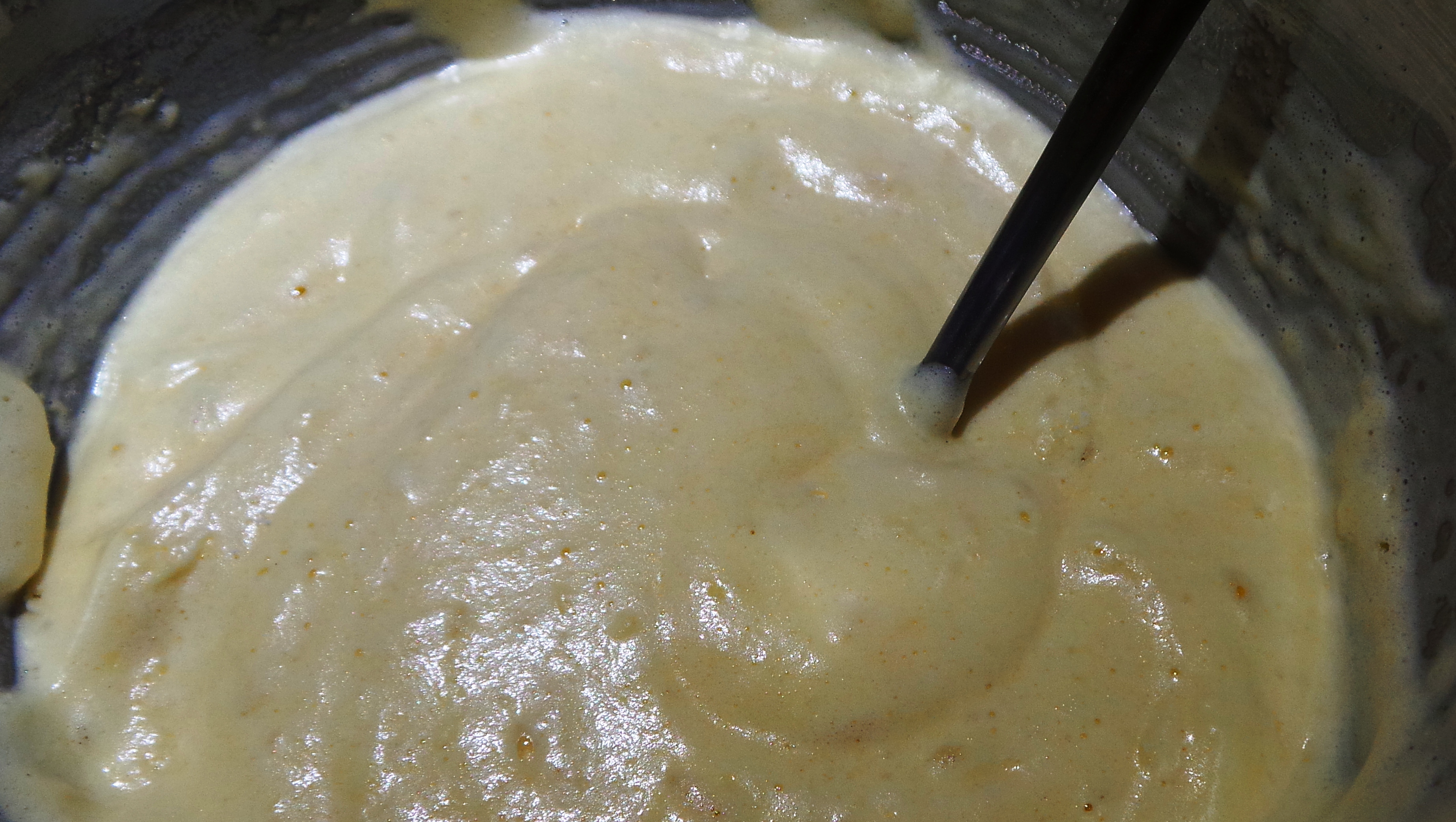 Some butter is melted and and used to saute an onion until translucent. Now I did this bit differently to the original recipe, as I didn’t want to risk a raw flour taste in the sauce. A few tablespoons of plain flour were then added and stirred to make a roux before the milk mix was whisked in and stirred until it boiled and thickened. Basically a fish-flavoured white sauce with onions in.