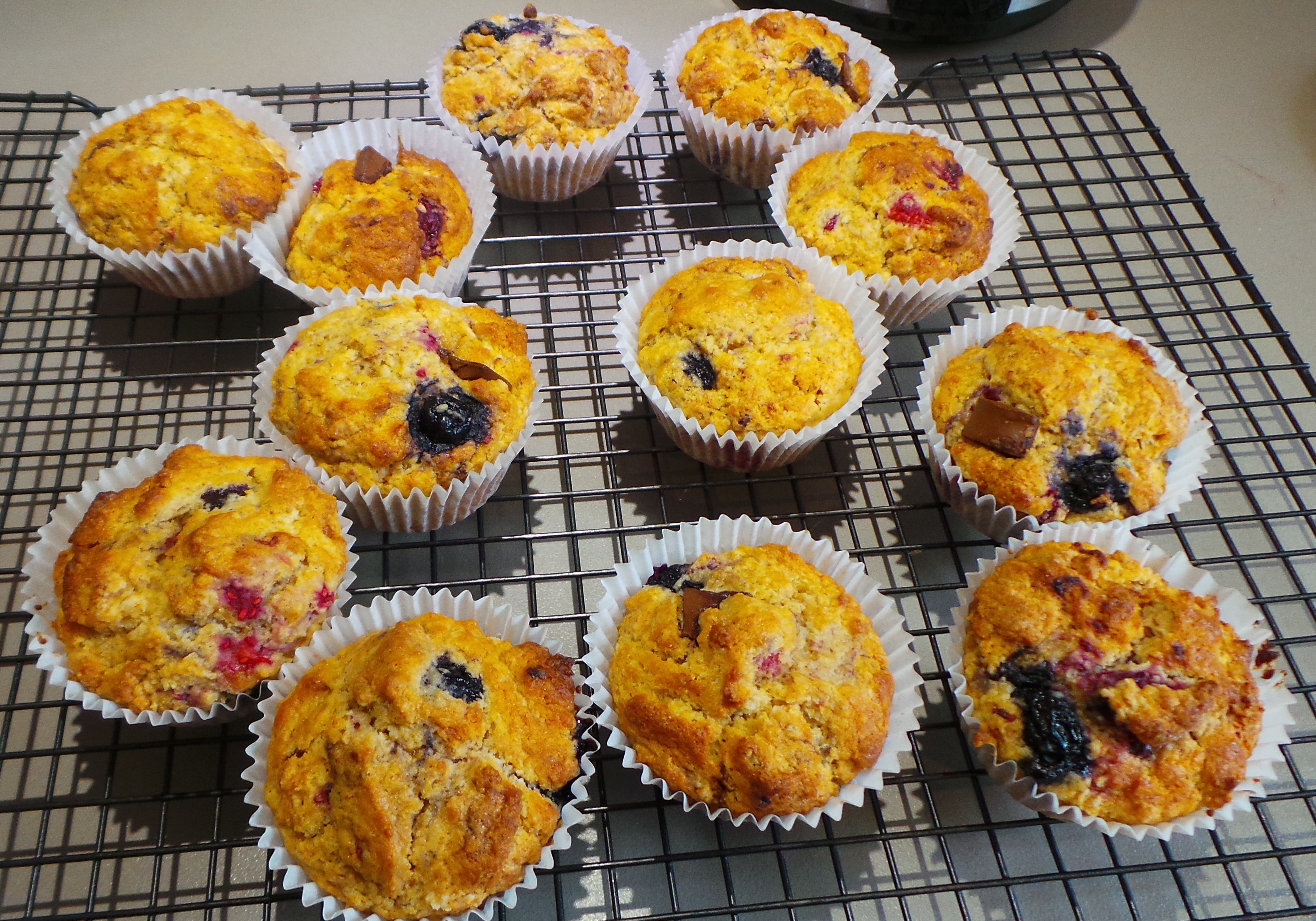 If you don’t own a muffin tray (I’ve had mine for nearly 20 years, add it to your list.) then use a flat baking sheet or pizza tray and place double thickness muffin cases on top and close together. You could even do this in a cake tin, if you wished.